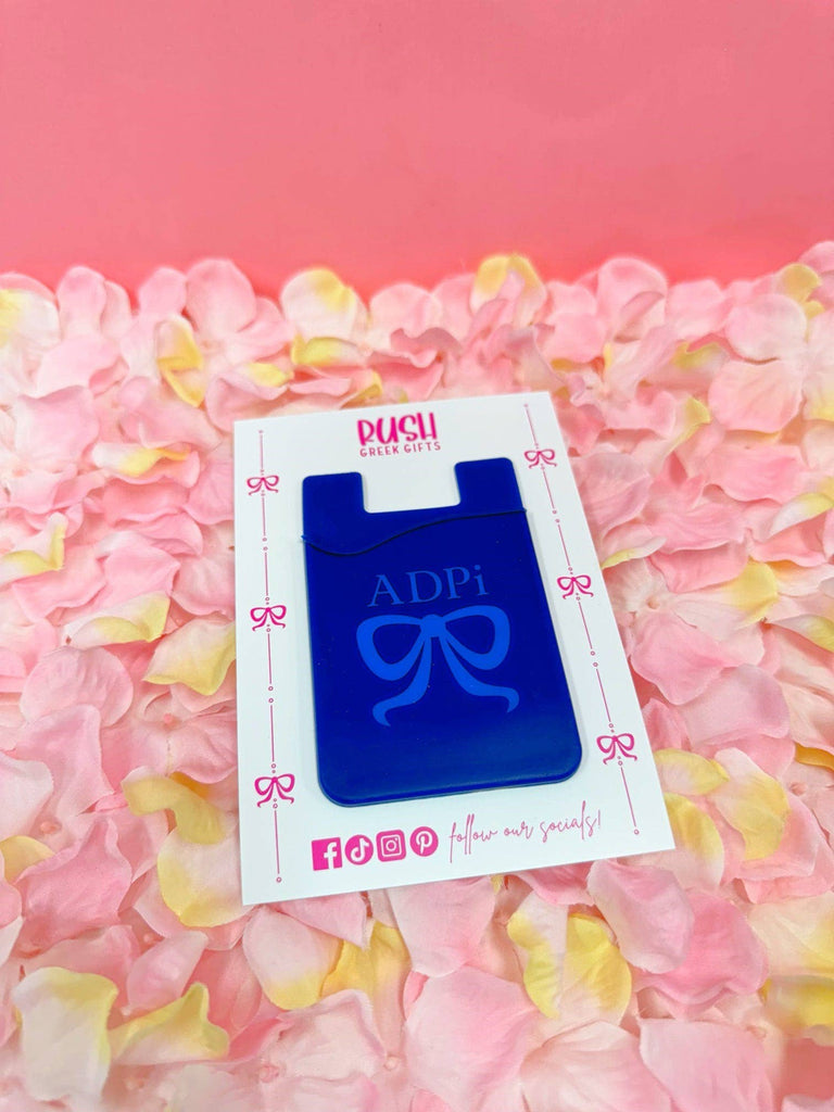 Our Sorority Bow Silicone Phone Wallet securely sticks to the back of a phone and carries important cards like a debit card, drivers license, and student ID! It's a necessity for a sorority girl and it looks cute with the sorority name and bow printed on it! It's the perfect stocking stuffer!